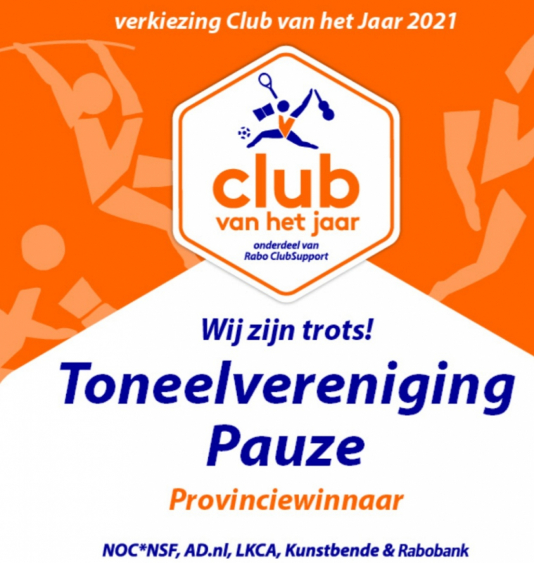 Toneelvereniging Pauze is in de verkiezing ‘Club van het jaar 2021’ de winnaar van de gemeente Middelburg en de provincie Zeeland geworden. Deze verkiezing is vanuit de Rabobank geïnitieerd om het fenomeen verenigen te vieren en te belonen. Dit jaar stond de veerkracht van de clubs centraal en anderen daarmee te inspireren om waardering en erkenning te krijgen. Doordat we de provincie winnaar zijn geworden mochten we maandag 31 mei pitchen voor de vakjury. Helaas zijn we niet geselecteerd voor de landelijke finale, maar kregen goede feedback op de performance van onze pitch.